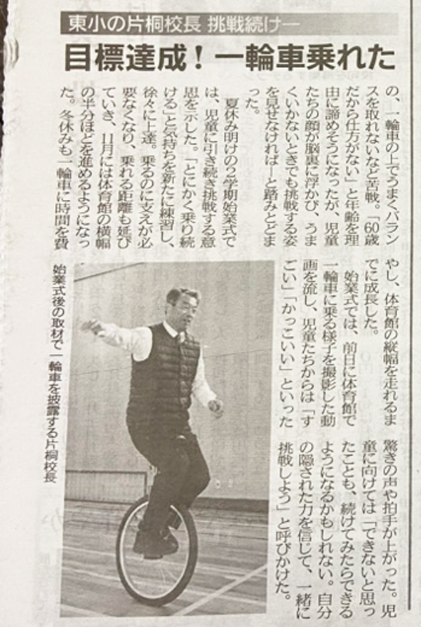 2025年の一学期の終業式に、児童に「夏休み中に、一輪車に乗ってみせます」と宣言をし、練習を重ねてきました。