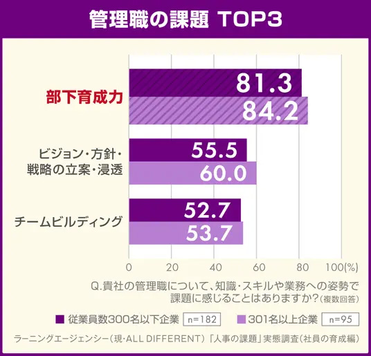 部下の育成力については、8割以上の管理職が課題と感じており、悩みの種になっている現実がうかがえます。