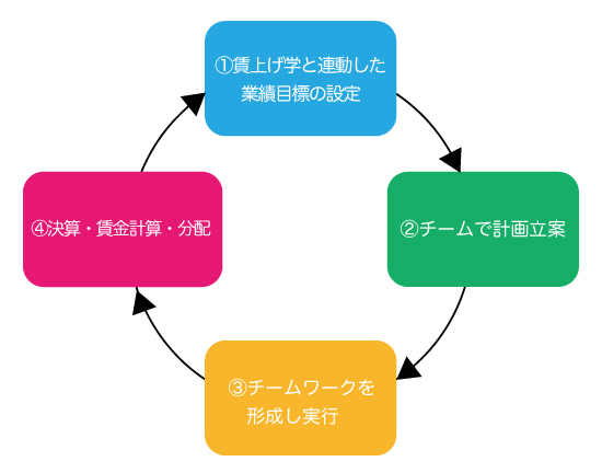 ①チームで業績目標を設定→②チームで計画立案→③実行→④決算・賃金計算・利益分配→再び①へ。